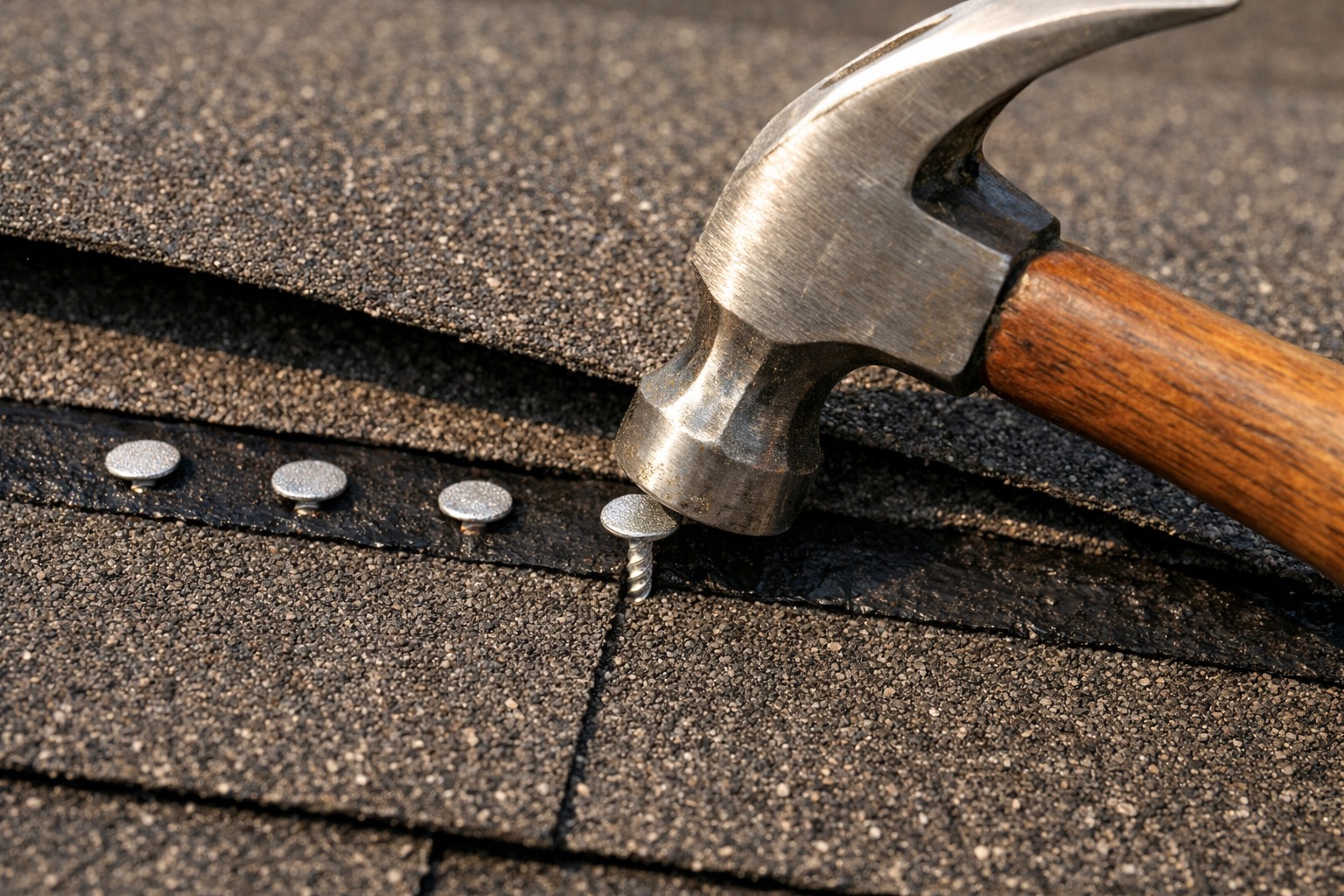 Do not nail too high on the shingle — this fails to penetrate the underlying shingle layer and drastically reduces wind resistance. Always nail on or just below the manufacturer's printed nailing line.