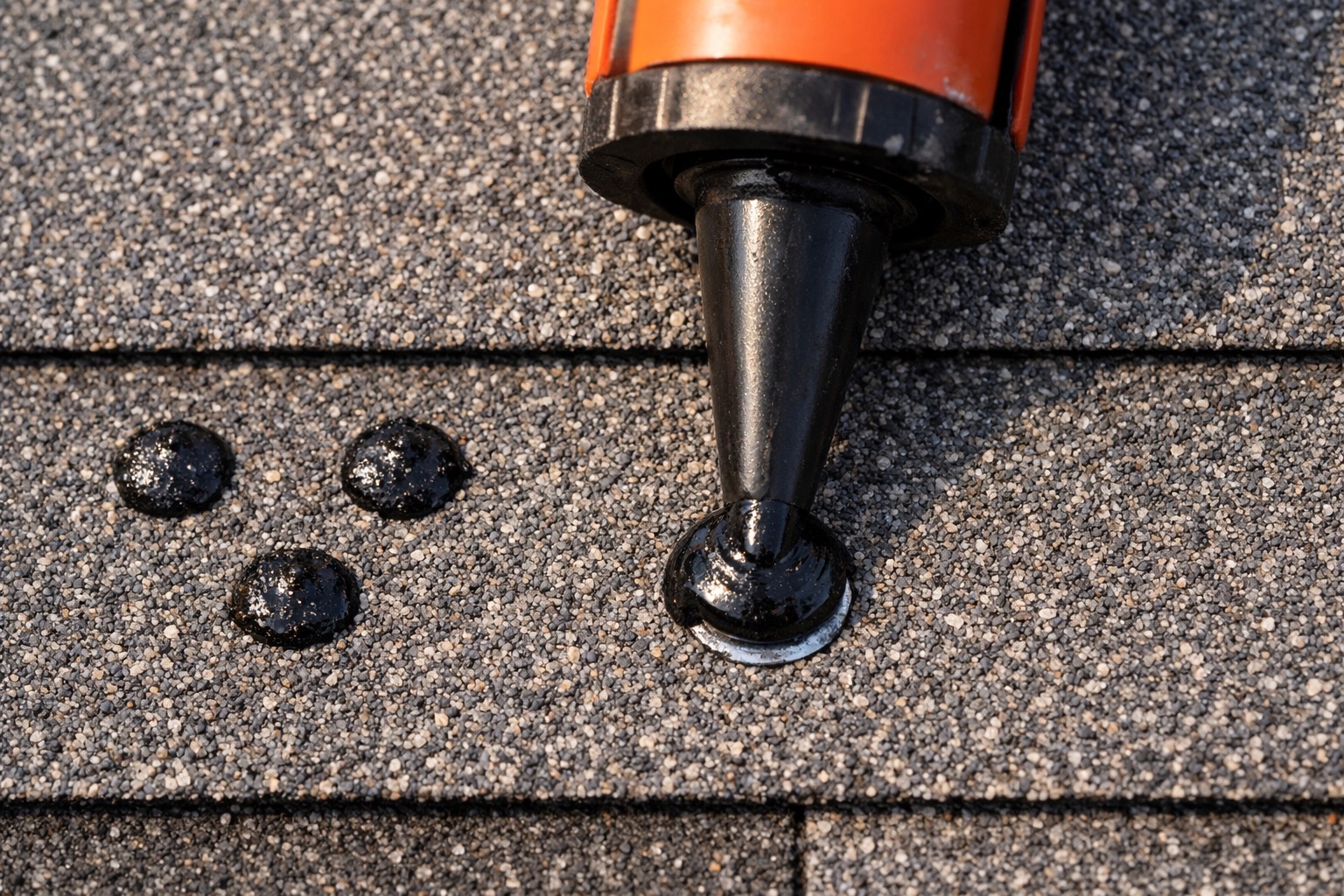 Load your caulking gun with roofing cement and apply a small dab (about the size of a quarter) over each exposed nail head to waterproof the penetrations. Then press the overlapping shingle courses back down into place and apply a thin bead of roofing cement under any edges that were disturbed during the repair to re-bond the sealant strips. Don't over-apply — excess roofing cement cracks over time and can channel water rather than repel it. A thin, targeted bead is all you need. Press firmly to seat the bond.
