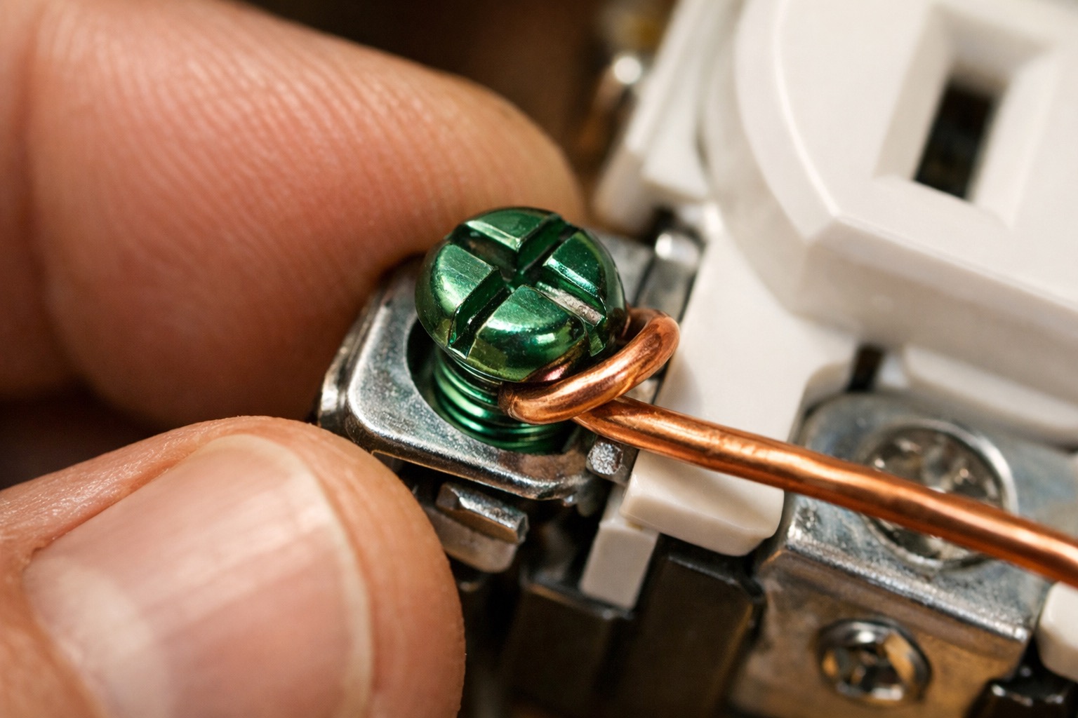 Start with the ground wire (bare copper or green insulated). Using needle-nose pliers, form a clockwise hook at the end of the wire — clockwise so that tightening the screw pulls the loop tighter rather than pushing it open. Hook the wire around the green grounding screw on the new outlet and tighten the screw until the wire is firmly clamped with no copper visible beyond the screw head. If the box is metal, there should also be a grounding pigtail connecting to the box itself.