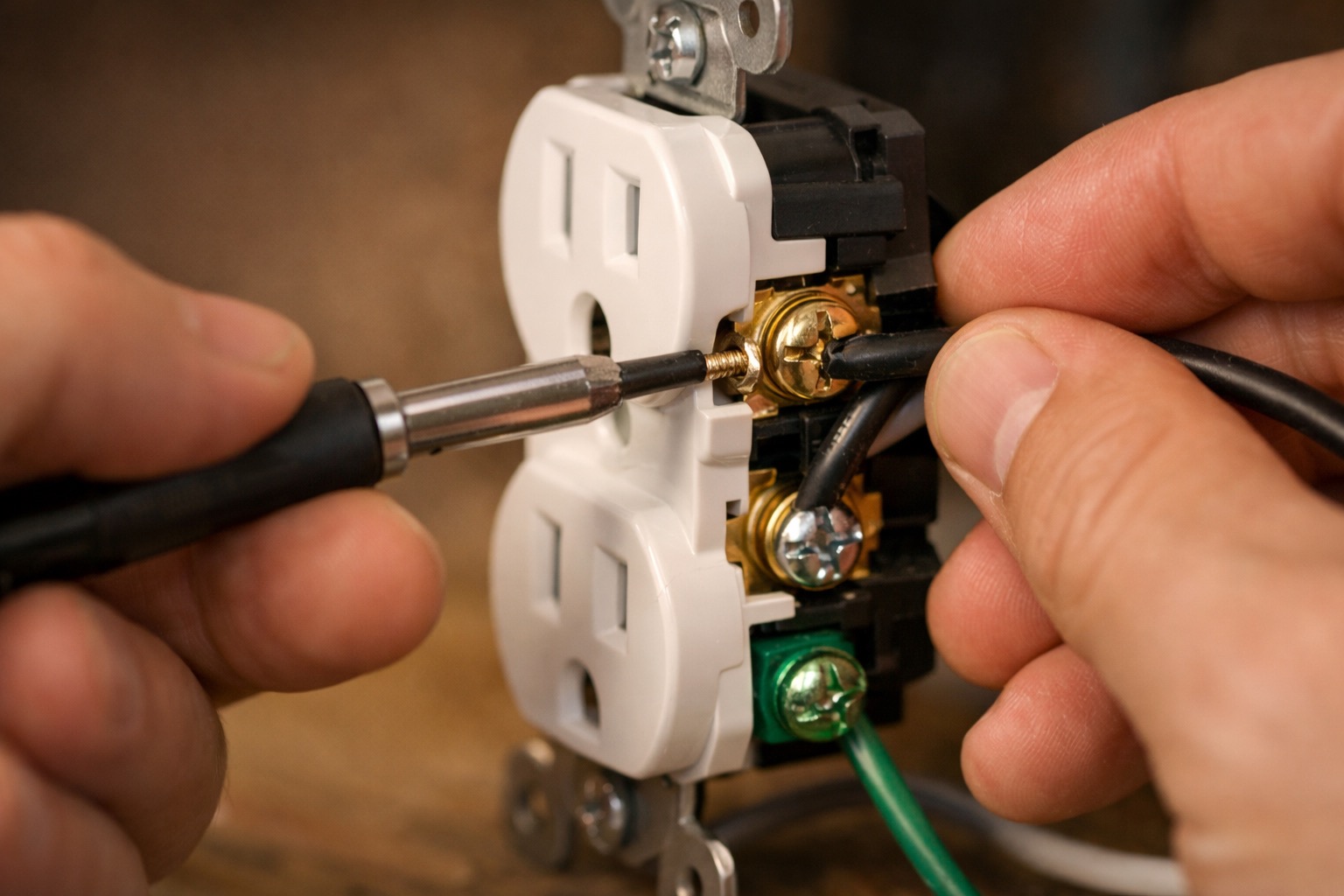 If you find back-stabbed wires (pushed into spring-loaded holes on the back), plan to move them to the side screw terminals on the new outlet. Back-stab connections loosen over time and are the number one cause of outlet failures and arcing.