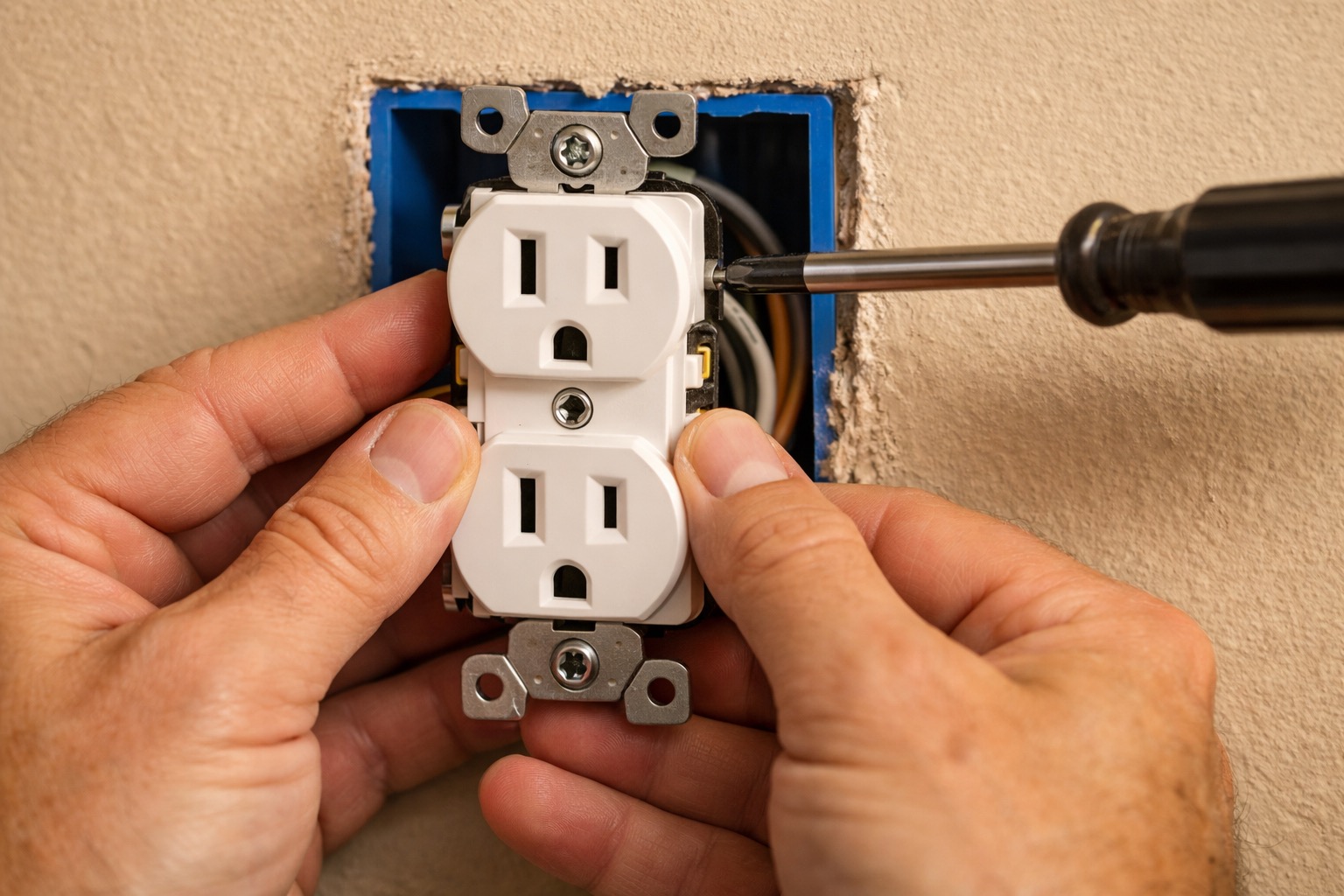 If the outlet sits recessed or proud of the wall, add or remove box extenders (plastic spacer rings, about $0.50 each) behind the mounting tabs until the outlet face is flush with the finished wall surface.