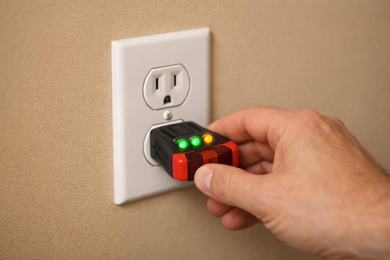 A three-light outlet tester is the fastest way to verify correct wiring. The light pattern chart printed on the tester tells you exactly what's wrong — reversed polarity, open ground, open neutral — so you can fix it without guessing.