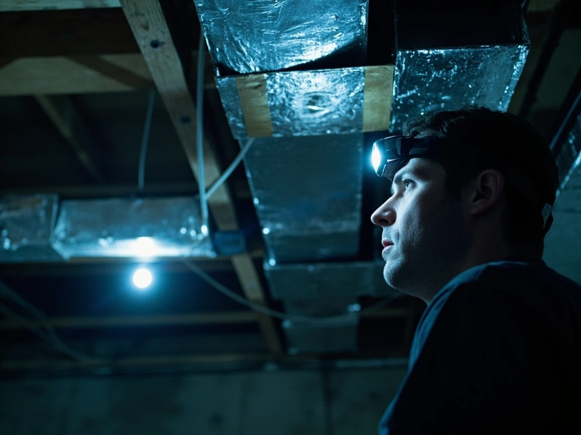 Before touching anything, switch the thermostat to OFF and flip the breaker for the furnace and air handler. Then walk or crawl along the entire duct run with a bright work light, looking for visible gaps at joints, elbows, branch take-offs, and where ducts meet the plenum at the air handler. Pay special attention to rectangular sheet-metal seams — they almost always leak along the long drive cleats and S-cleats where the sheets meet. Mark every leak point with a piece of masking tape or a sharpie so you do not forget any when you start applying mastic.