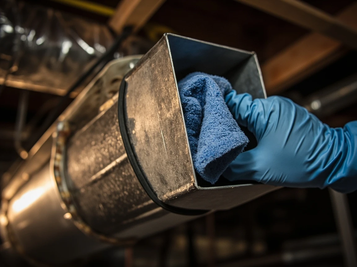 Mastic and foil tape bond chemically to clean metal — if you apply them over dust, grease, or cobwebs, you are sealing the dirt, not the duct, and the seal will peel off within weeks. Wipe down every seam, joint, and 2-inch band around each leak location with a dry shop rag or microfiber cloth. For greasy kitchen-adjacent ducts or years of grime, use a rag dampened with rubbing alcohol or soapy water and let the surface dry completely before moving on. Do not skip this step — it is the single biggest reason DIY duct sealing fails.