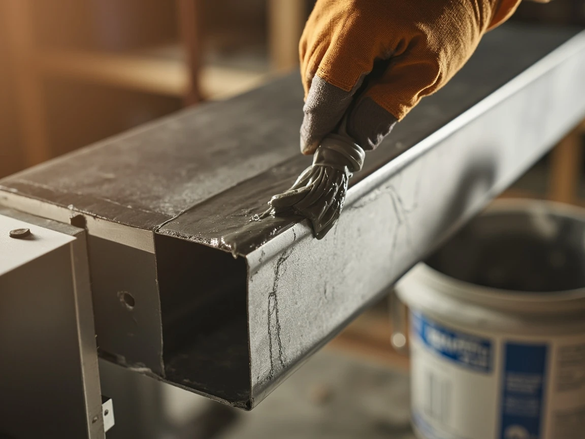 Open the mastic bucket, dip a disposable chip brush about an inch deep, and spread a nickel-thick layer over every seam, joint, elbow, and branch connection — including the ones that do not appear to be leaking. Mastic should extend at least 1 inch on either side of each seam to create a wide sealing band. Work the paste into the crevices and around protruding screws. It will feel like frosting a cake with cold icing — messy but satisfying. The mastic is gray when wet and cures to a slightly darker color over 24 hours, forming a permanent, flexible seal.