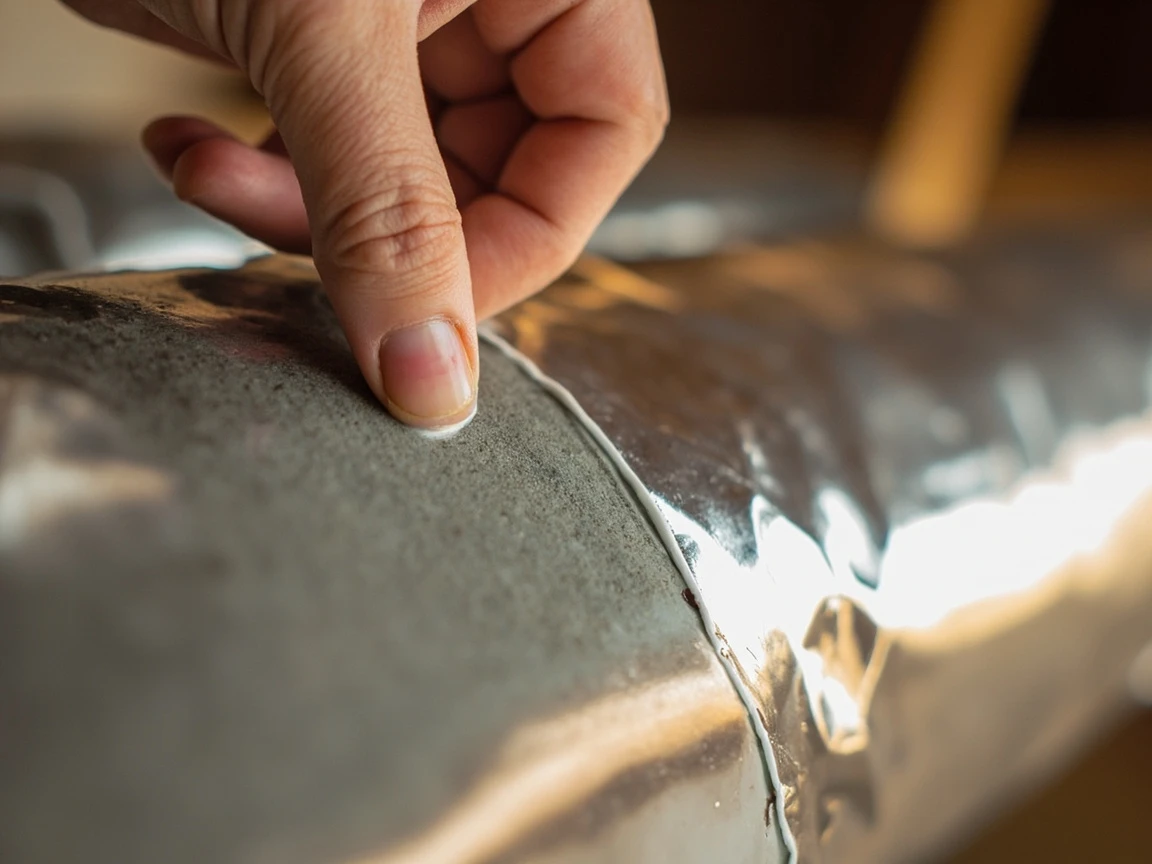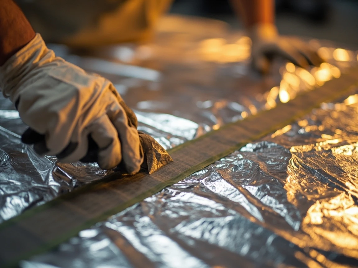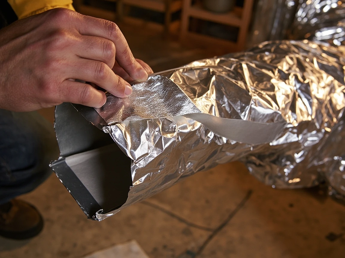Go back over your wrapped ducts and run a strip of UL 181 foil tape along every longitudinal seam, every butt joint between sections, and every place the foil facing was punctured by a zip tie or staple. The foil facing is not just for looks — it is a vapor barrier that prevents humid air from reaching the cold metal duct. A single unsealed 3-inch gap in the facing can let enough humidity through to condense pints of water during the cooling season, soaking the fiberglass and destroying its insulating value. Burnish every tape edge firmly to seal it.