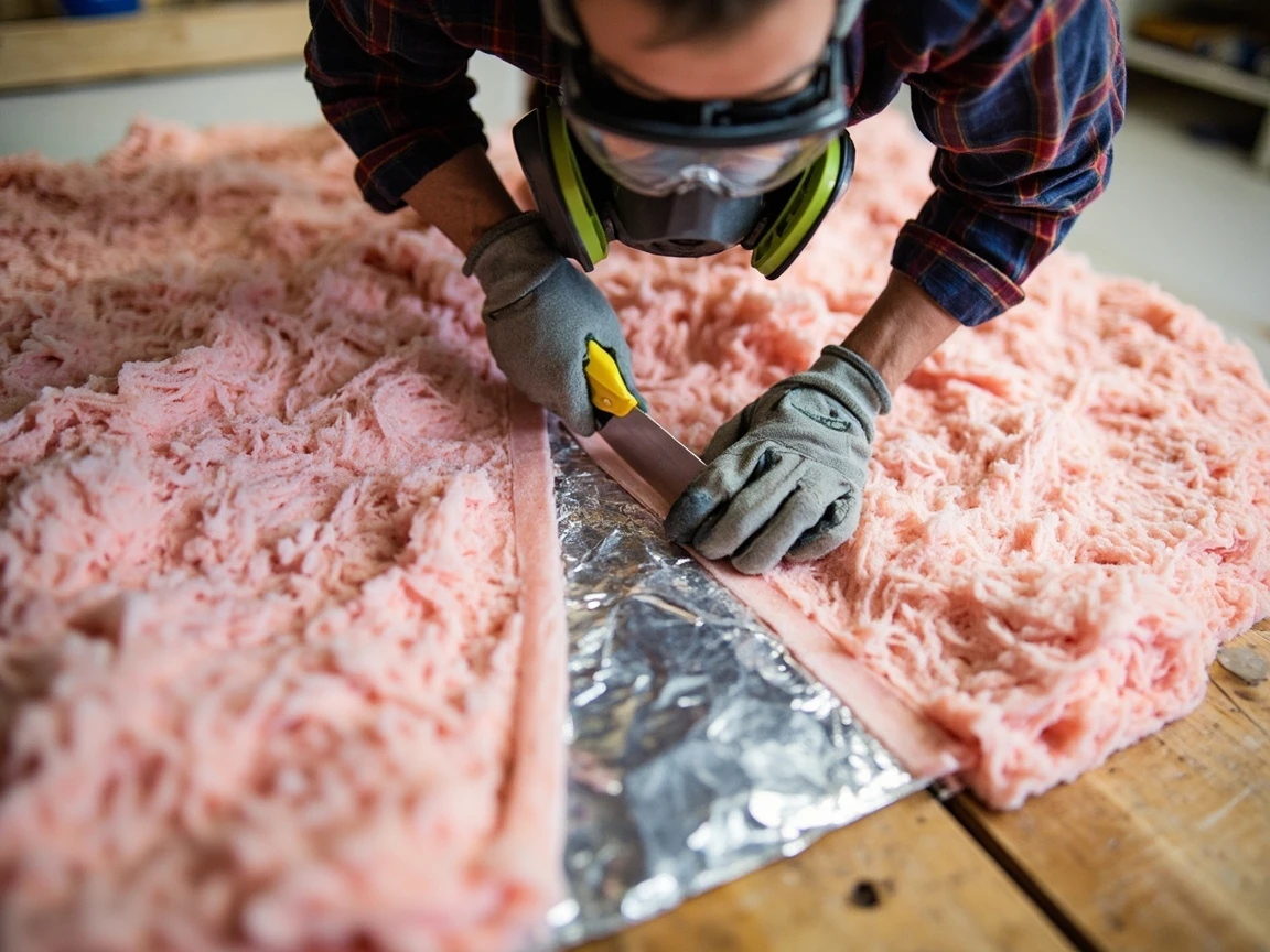 R-8 foil-faced fiberglass duct wrap comes in 48-inch-wide rolls. To wrap a rectangular duct, measure the full perimeter (add up all four sides) and add 2 inches for overlap — that is your cut length. For round ducts, wrap a string around the duct to get the circumference and add the 2-inch overlap. Lay the wrap foil-side down on a clean surface, mark your cut line with a sharpie, and cut through the fiberglass cleanly with a sharp utility knife. Wear a respirator, gloves, and long sleeves during this step — the cut edges release fiberglass dust.