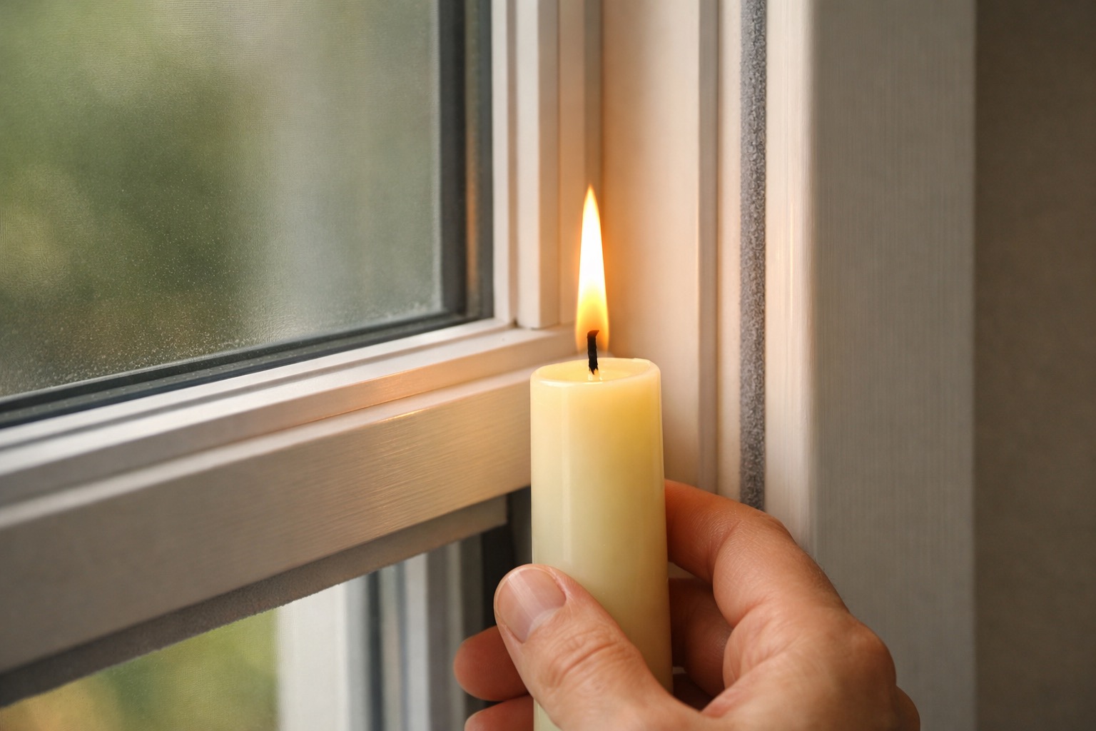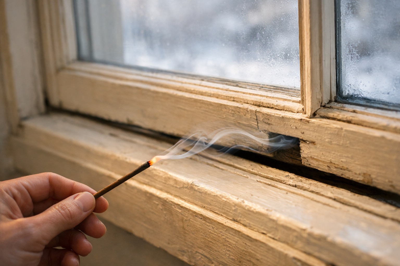 On a cold or windy day, hold a lit candle or stick of incense near the edges of each window — where the sash meets the frame, where the glass meets the frame, and where the frame meets the wall. Watch the flame or smoke: if it flickers, bends, or gets pulled sideways, you've found a draft. Mark each leak location with a small piece of painter's tape. Check the window lock too — many drafts are simply caused by a window that doesn't close or latch tightly.