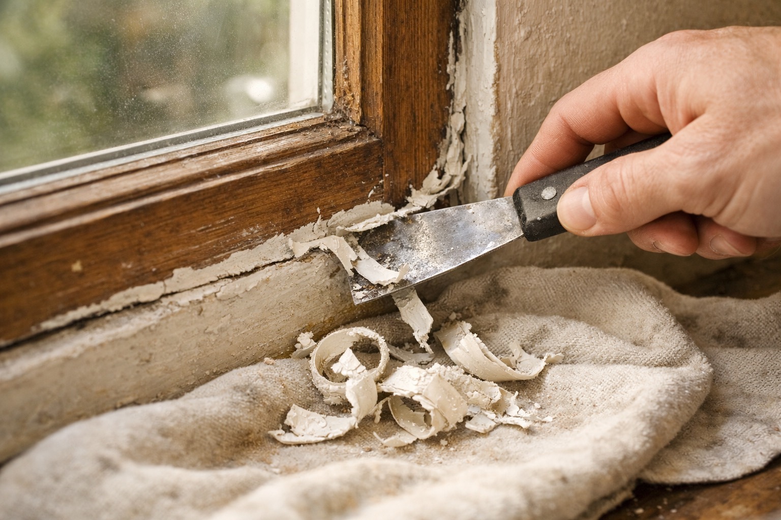 Before applying new sealant, you need to remove any cracked, peeling, or brittle old caulk and worn-out weatherstripping. Use a utility knife to score along the edges of old caulk, then peel and scrape it away with a putty knife. Pull off any old foam tape or felt weatherstripping — it usually comes off in strips. Scrape any adhesive residue with the putty knife and wipe the surface clean with rubbing alcohol on a rag. New sealant won't stick properly over old, degraded material.