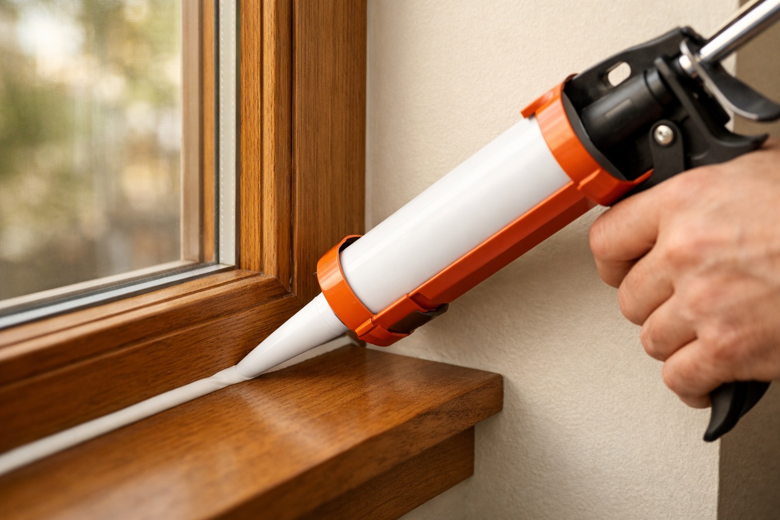 Caulk is for joints that don't move — the seam where the window frame meets the wall (both interior and exterior), and where the glass pane meets the frame (the glazing line). Cut the caulk tube nozzle at a 45-degree angle to create a 1/8-inch opening. Hold the gun at a 45-degree angle to the joint and squeeze a steady, continuous bead along the entire seam. Immediately smooth the bead with a wet finger or a damp rag, pressing it into the gap. Use paintable latex caulk on interior surfaces and silicone caulk on exterior surfaces for better weather resistance.