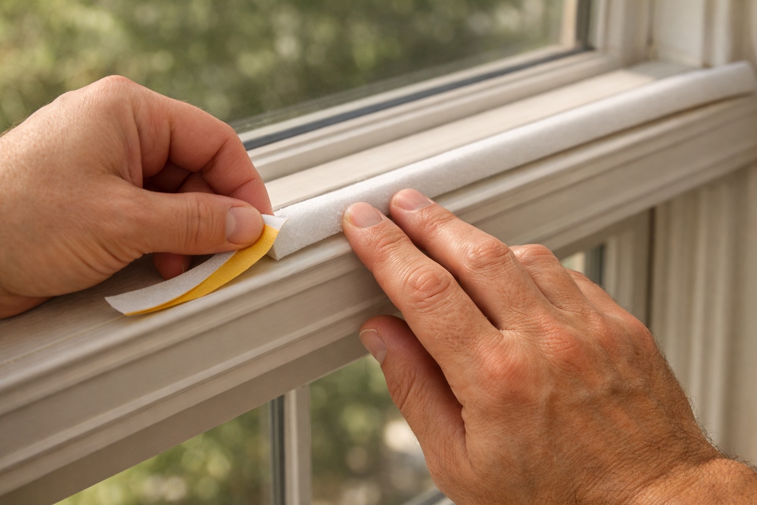 For double-hung windows, the biggest draft source is usually the meeting rail — the horizontal bar where the upper and lower sashes overlap in the middle. Apply a strip of foam tape on the bottom edge of the upper sash's meeting rail so it compresses against the lower sash when both are closed.