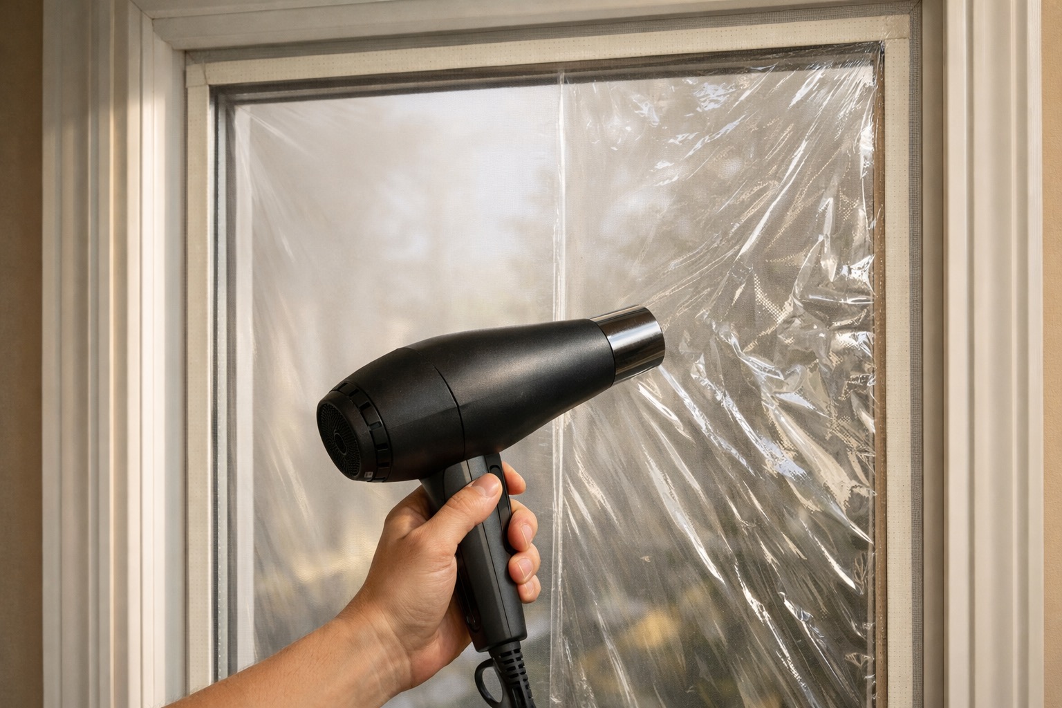 For windows you won't open until spring, a clear shrink-film kit adds a dead-air insulating layer that mimics the effect of a second pane of glass. Clean the window frame with rubbing alcohol and let it dry. Apply the double-sided tape from the kit around the entire perimeter of the frame (not the glass). Cut the plastic film slightly larger than the window and press it onto the tape, starting at the top and working down. Use a hair dryer on medium heat, holding it 2-3 inches from the film, and slowly sweep across the surface — the film will shrink taut and become nearly invisible.