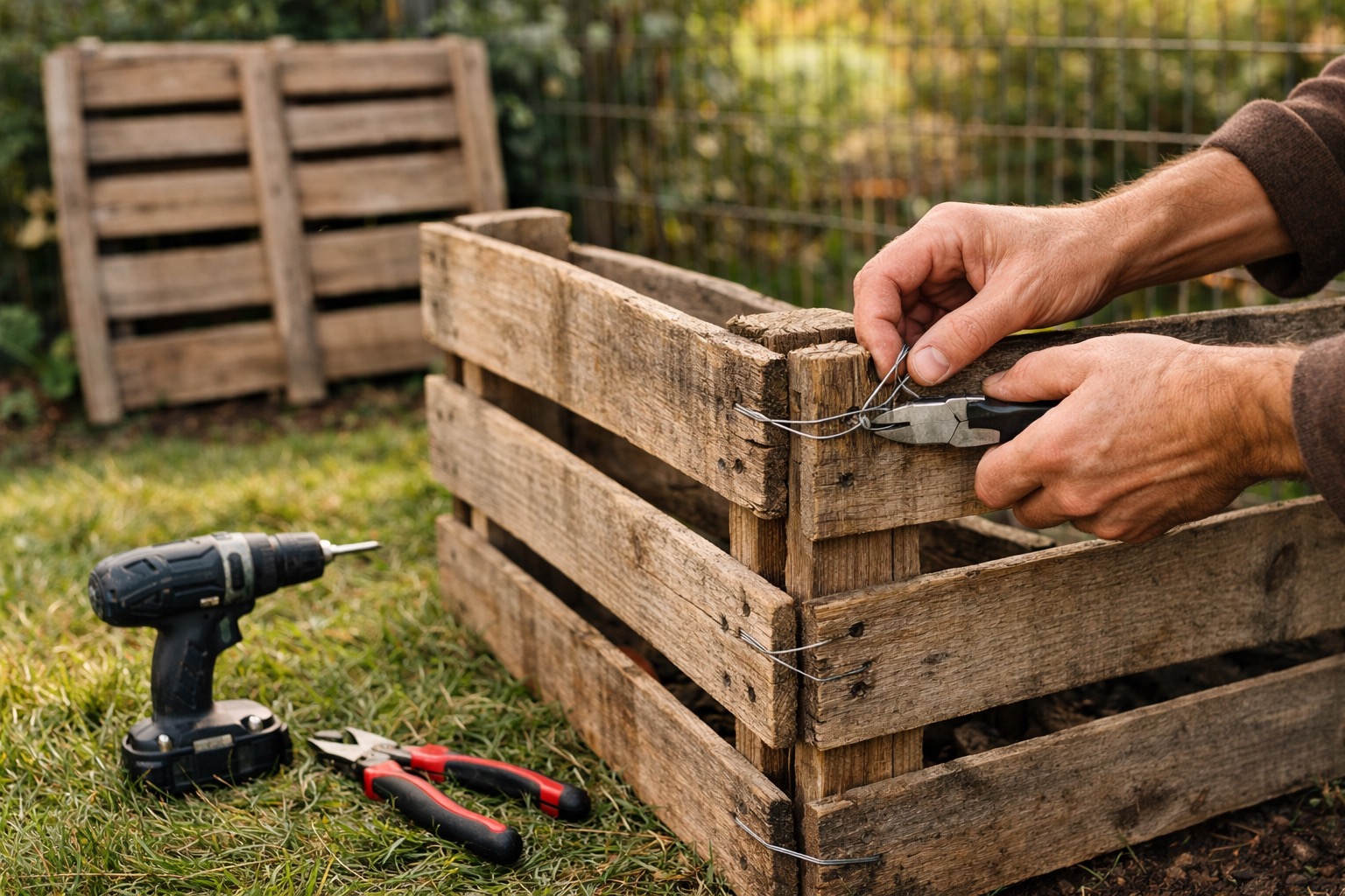 A commercial plastic compost bin works well for beginners and costs $30-60. Alternatively, wire four wooden pallets together into a square enclosure — pallets are often free from lumber yards and grocery stores. Minimum effective size is 3'×3'×3'. For solid containers, drill 1/2" holes every 6 inches in the sides and bottom for airflow and drainage.