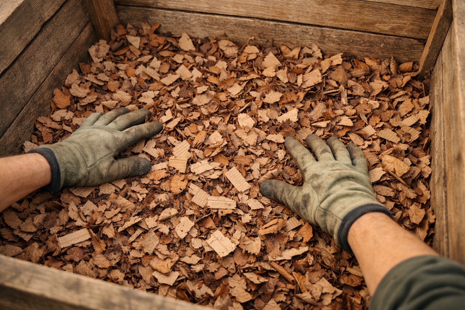 Start with a 4-6 inch layer of brown, carbon-rich materials: dry leaves, shredded corrugated cardboard (remove tape), wood chips, or straw. Brown materials provide carbon, absorb moisture, and create air pockets. Never use glossy paper or cardboard with heavy printing.