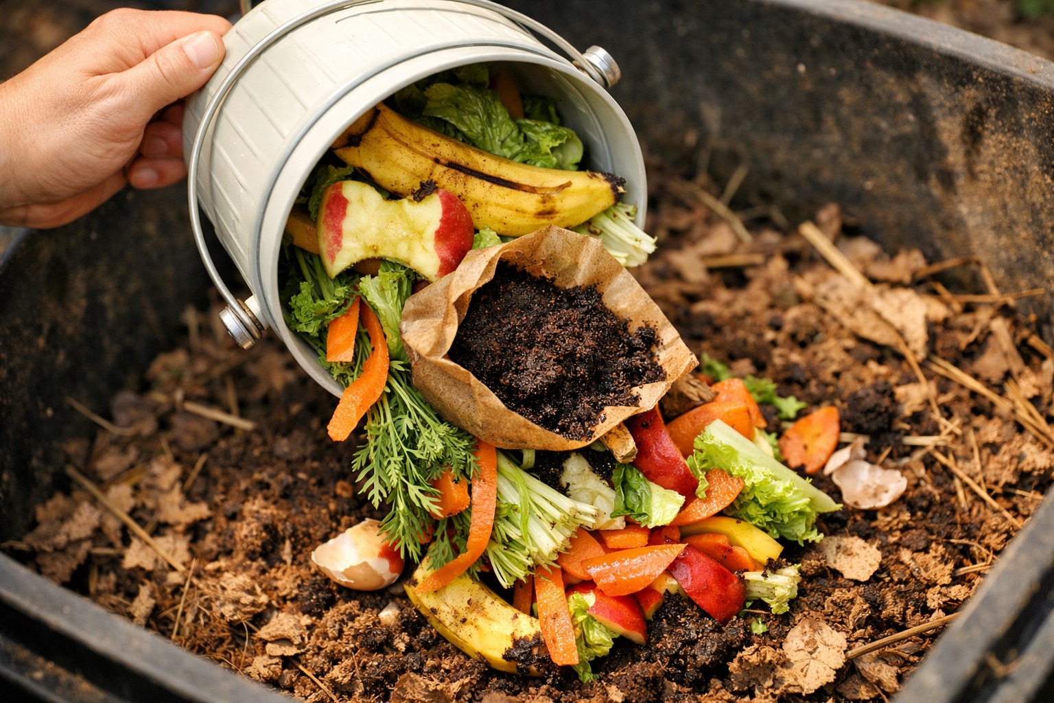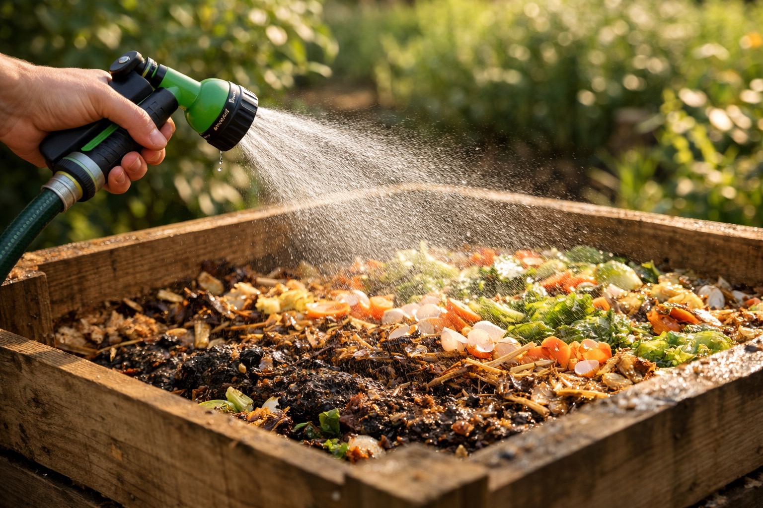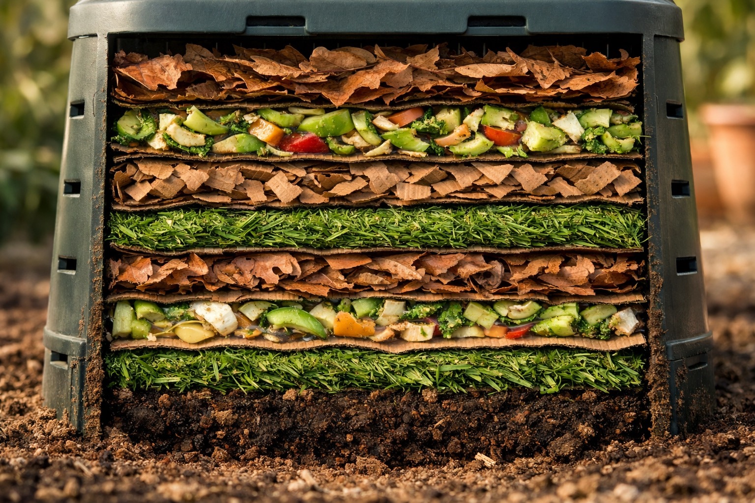 Add a 2-3 inch layer of nitrogen-rich green materials: raw fruit and vegetable scraps, fresh-cut grass clippings, coffee grounds and filters, tea bags, or fresh plant trimmings. The ideal carbon-to-nitrogen ratio is roughly 3:1 by volume — 3 parts browns to 1 part greens.
