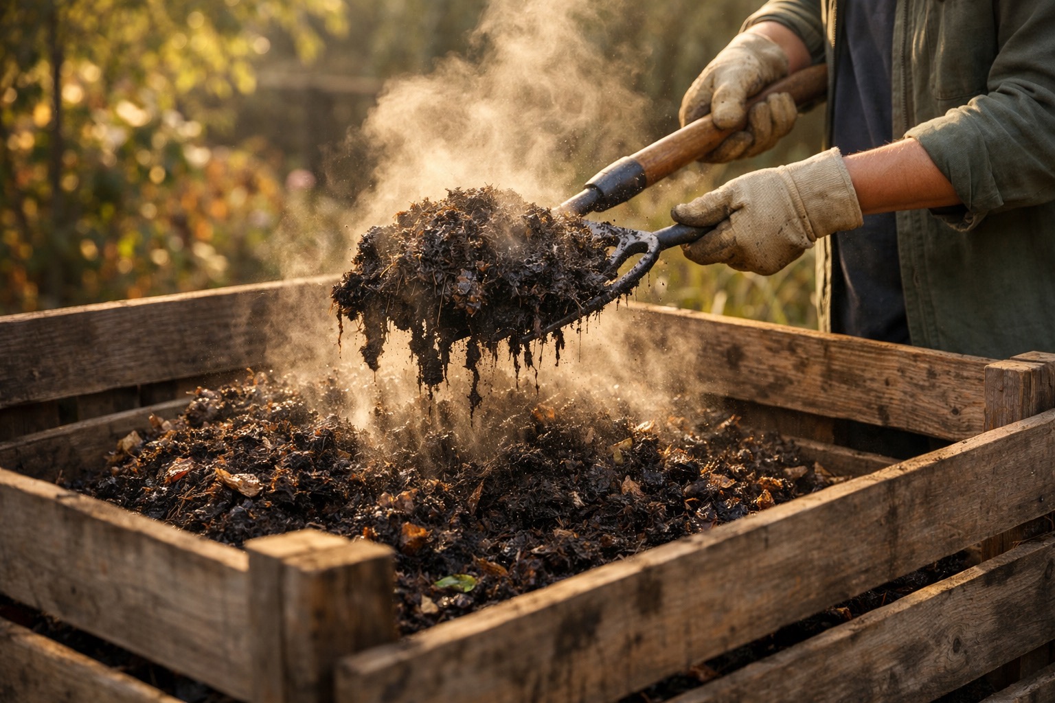 After 1-2 weeks, use a garden fork to turn the pile, moving outside material to the center and inside material to the edges. Turning introduces oxygen, which is essential for aerobic decomposition. An active, hot pile (130-160°F internally) needs turning every 1-2 weeks. Cold composting works too — just add material and turn monthly.